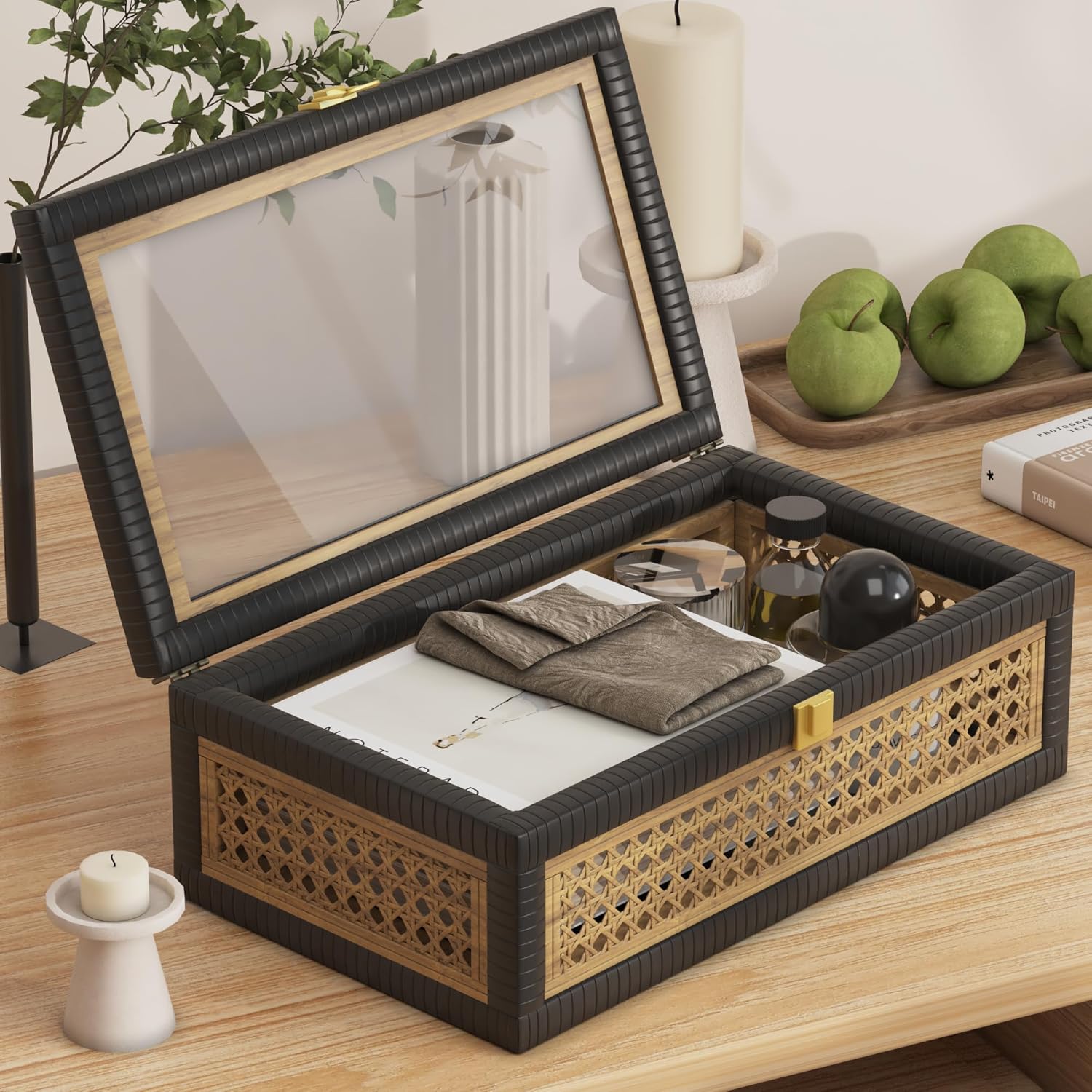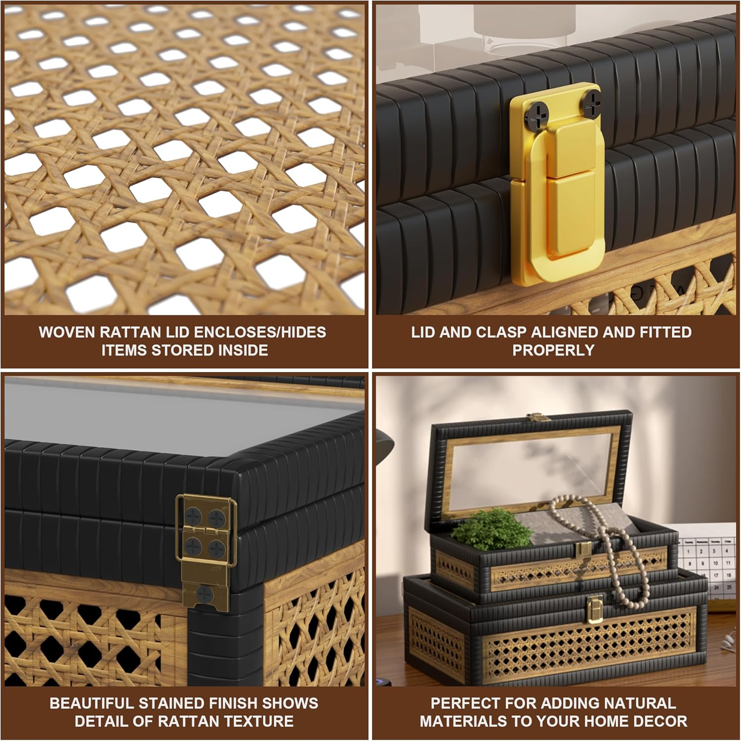 Rattan Decorative Box,Boho Display Boxes with Lids,Set of 2 Rectangular Wicker Storage Decoration,Natural Woven Cane Bins for Home Decor for Rustic Farmhouse(Yellow and Black)