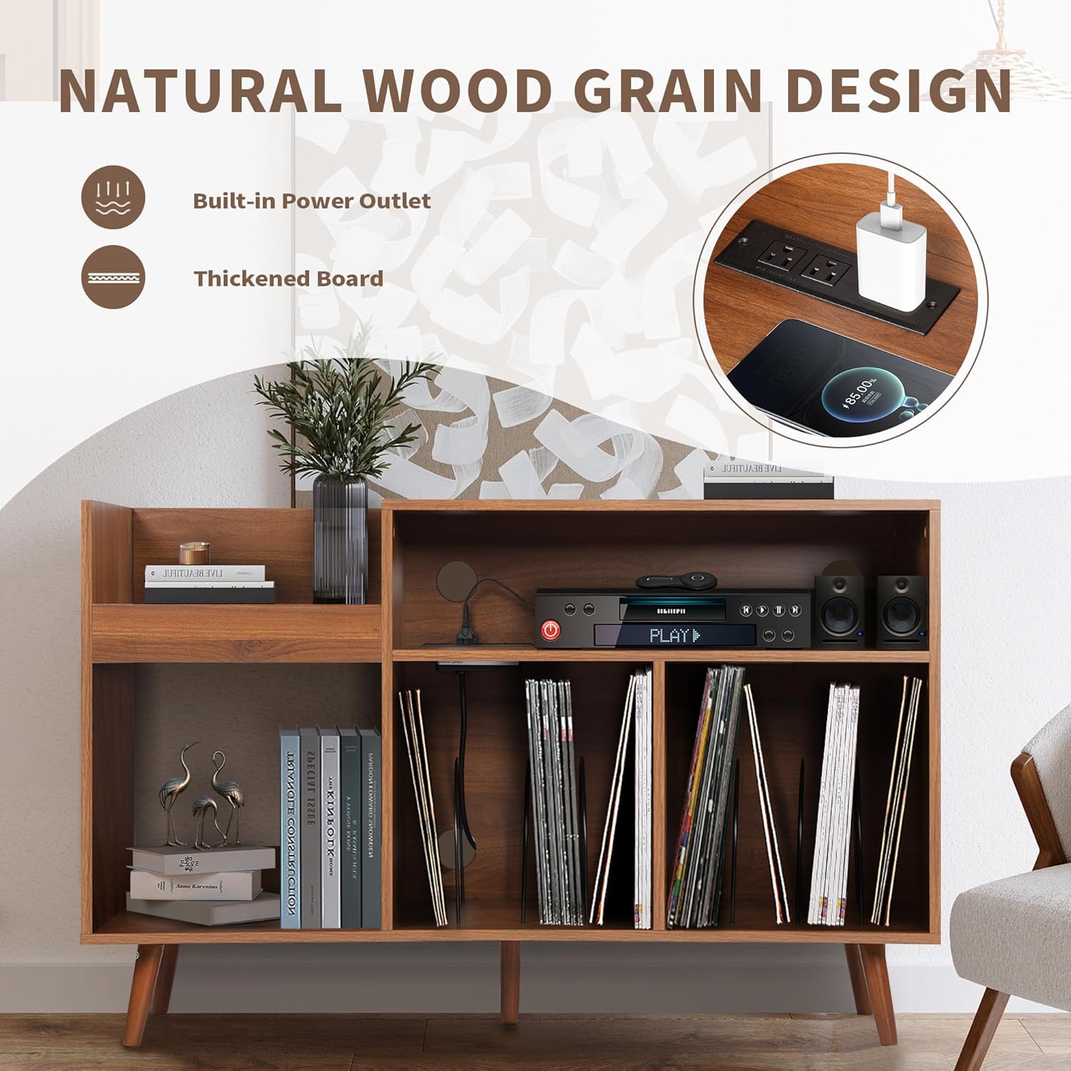 Record Player Stand with Charging Station & USB Ports, Mid-Century Turntable Stand Table Holds Up to 300 Albums, Vinyl Record Storage Cabinet with Wood Legs for Living Room Office(Walnut)